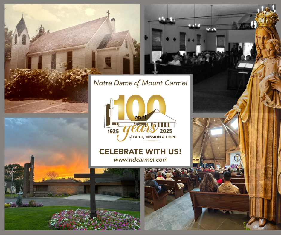 Our beloved parish of Notre Dame of Mt. Carmel is turning 100 years old this year! While July 5, 1925, is the official date of our church dedication, July 5, 2025, will mark just the beginning of a year-long centennial celebration filled with FAITH, fellowship, gratitude, MISSION, and HOPE!