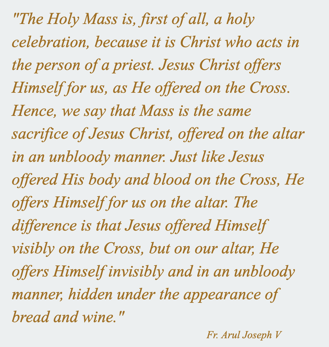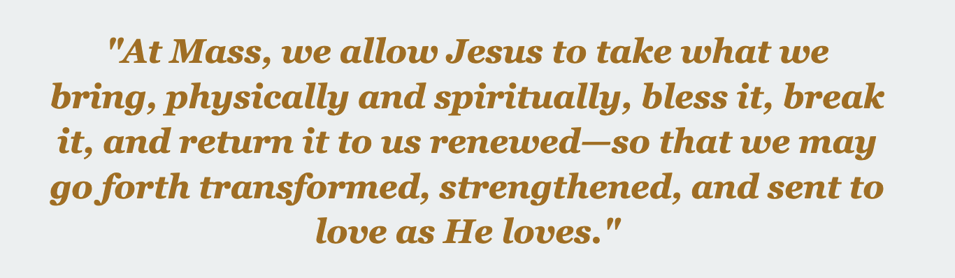 At the Mass, bread and wine are offered, and we, as Catholics, believe God transforms them into His Real Presence and own self-gift: His Body and His Blood. This is how Jesus continues to give Himself to people—not symbolically, but in a present, deeply real and spiritual way.