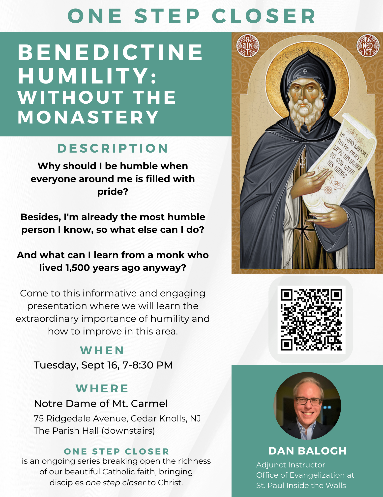 Do you have questions about "One Step Closer"? Do you have suggestions for future presentations? Are you a regular attendee who would you like to be a guest presenter on a topic that sets your heart on fire? Please email Dan Balogh at [email protected]