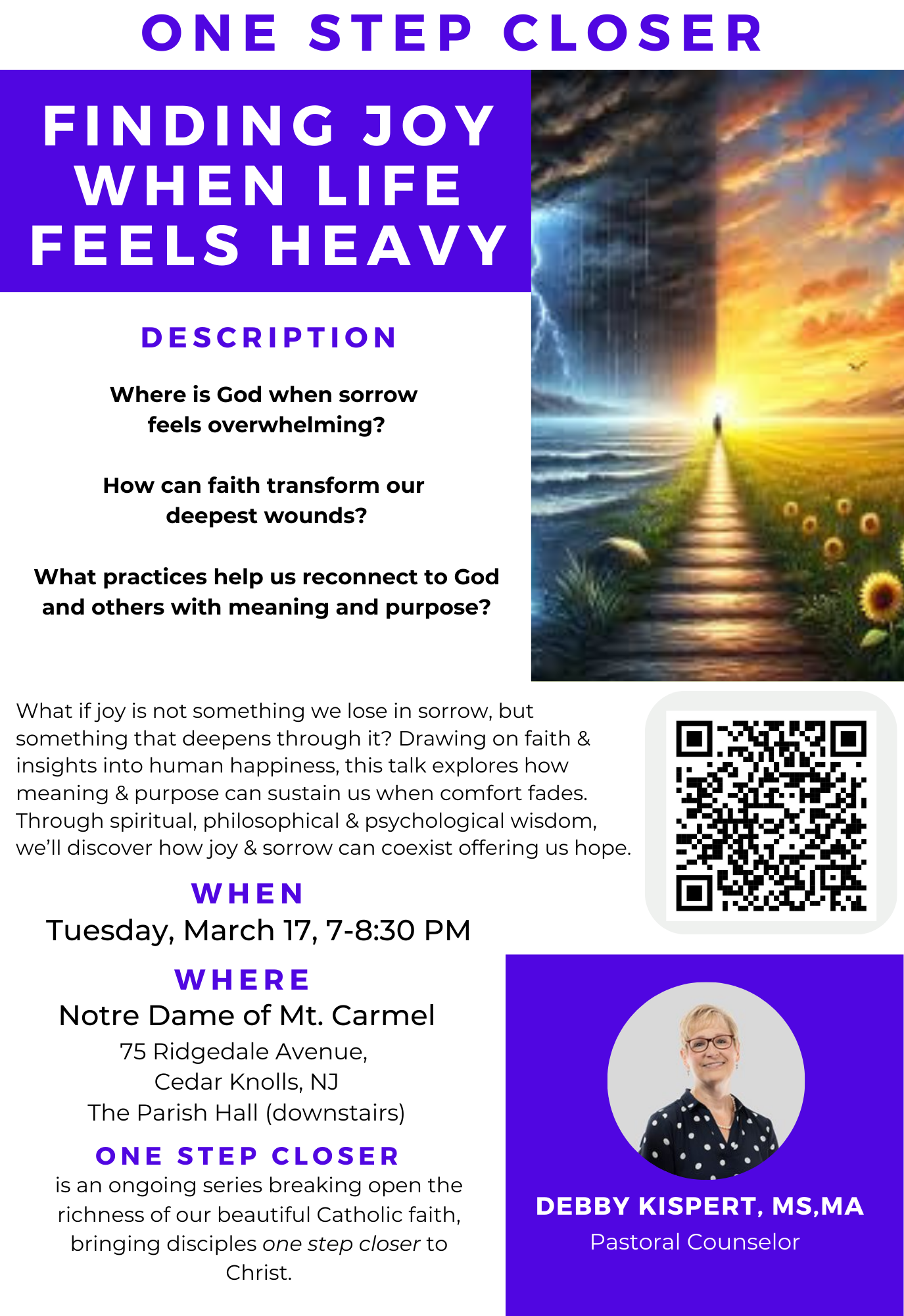 Pastoral counselor Debby Kispert will draw on faith and insights into human happiness, exploring how meaning and purpose can sustain us when comfort fades. We'll discover how joy and sorrow can coexist, offering us help. Where is God when sorrow feels overwhelming? How can faith transform our deepest wounds. What practices help us reconnect to God and others with meaning and purpose?