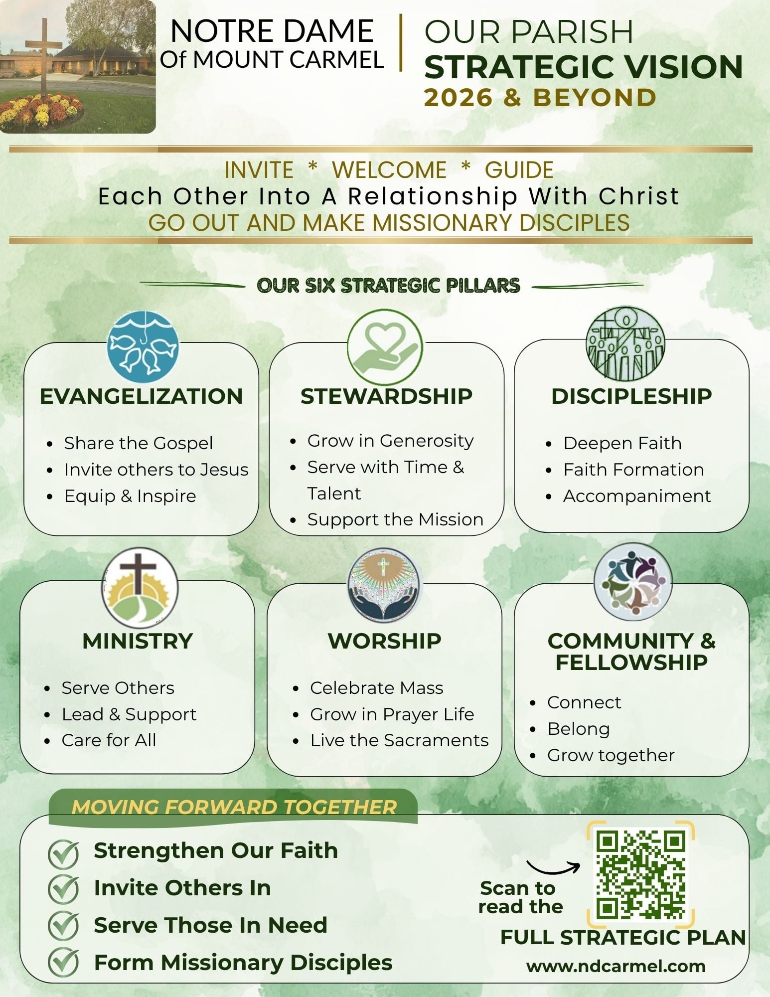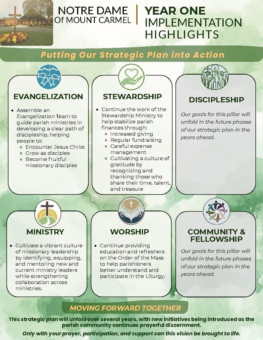 The PPC will support parishioners and staff in carrying out the year‑one goals. Any parishioner who feels called to work on any part of the plan is encouraged to do so. They are warmly invited to contact Chair Dan Balogh ([email protected]) or Vice Chair Jen Qvotrup ([email protected]) to discuss ideas and involvement. Together, parishioners and the PPC can discern the actions and steps needed to make the plan a reality.